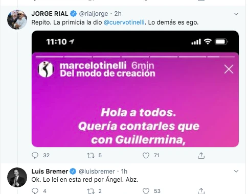 Los posteos prácticamente coincidieron en el mismo tiempo. Consabido que existe cierta pica o competitividad entre ambos, los usuarios se metieron y tomaron posición respecto a quién fue el primero en informar este bombazo. Encima, Luis Bremer, otro periodista especializado, tuiteó: “La noticia de la mañana, primicia de Ángel de Brito”.