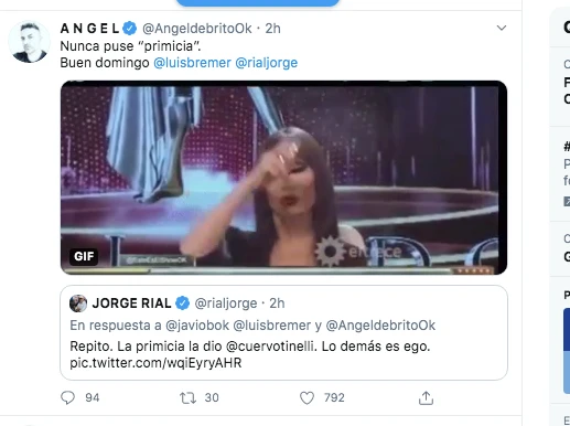 De Brito no se quedó callado y jugó también en esa cancha. En primera instancia al escribirle “gracias” a Bremer. Pero lo más picante vino después, dado que Ángel le respondió directamente a Rial: “Nunca puse primicia. Buen domingo Luis y Jorge”. Encima lo acompañó de un meme de Moria Casán en el que se sacude perfume por encima, con una intención de remarcar un concepto como “que hablen los demás, a mi me resbala”.