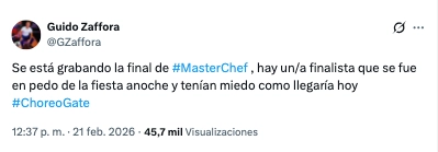 “Se está grabando la final de #MasterChef , hay un/a finalista que se fue en pedo de la fiesta anoche y tenían miedo como llegaría hoy #ChoreoGate”, escribió el periodista. Si bien se trató de un episodio en pleno festejo, la final del ciclo ya venía teniendo problemas porque hace días se habla de “acomodos”. Esto hizo que se ponga en discusión la transparencia del programa de Wanda.