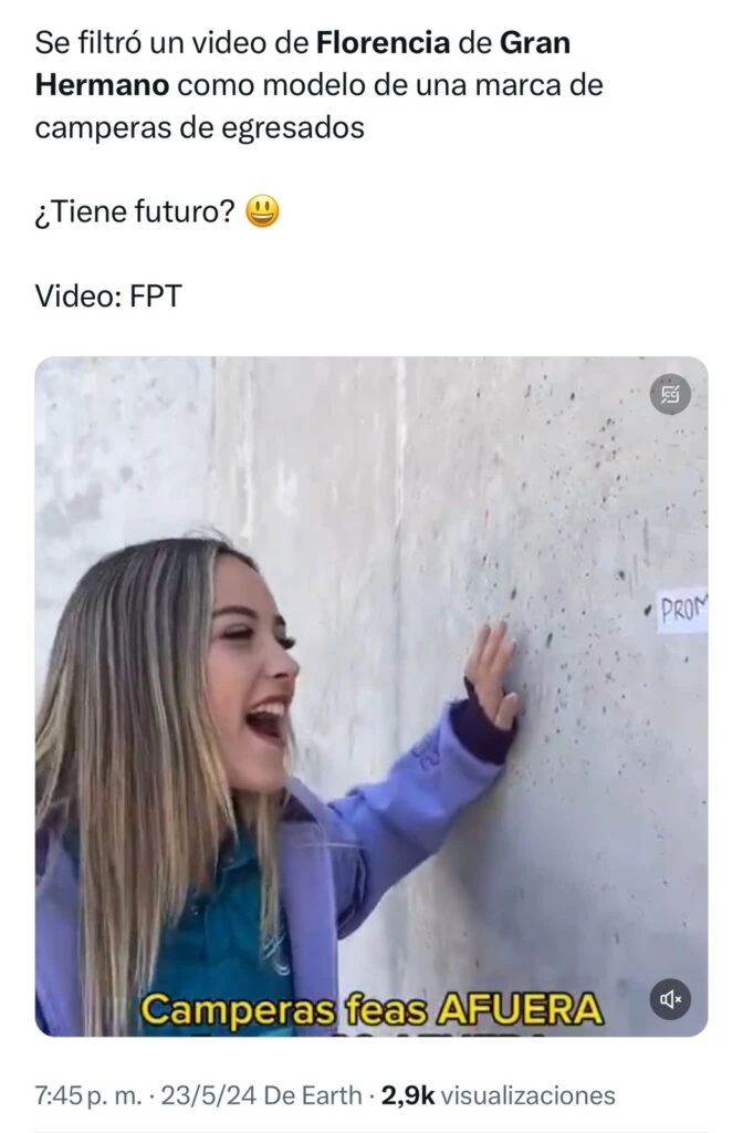 Y es ese material el que se viralizó en las últimas horas, no por la campaña en sí, donde promociona una marca que se dedica a la venta y confección de camperas y remeras de egresados, sino por el divertido y polémico contenido que Flor generó en él.