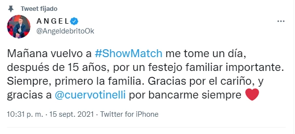 "Mañana vuelvo a #ShowMatch me tome un día, después de 15 años, por un festejo familiar importante. Siempre, primero la familia. Gracias por el cariño, y gracias a @cuervotinelli por bancarme siempre", escribió Ángel en sus redes.