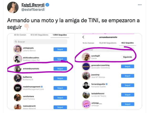 Y como si fuera poco, ahora Estefi Berardi hizo gala de sus averiguaciones de todo lo que sucede en el universo digital detectó que Armando comenzó a seguir a la mejor amiga de Tini Stoessel. ¿Entonces? Ese guiño aparenta un intención de averiguar si la China coqueteó o no con Rodrigo de Paul, una versión que se viralizó en las últimas semanas.