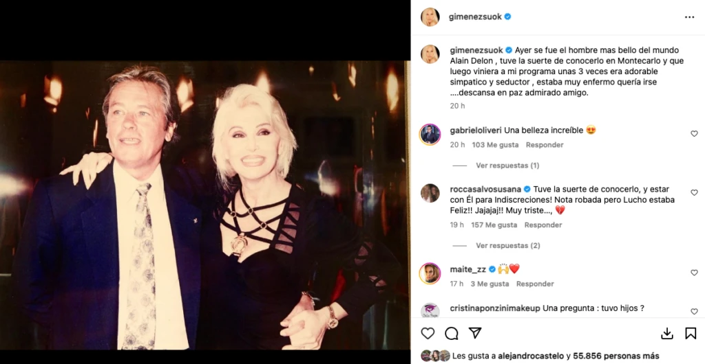 “Ayer se fue el hombre más bello del mundo, Alain Delon. Tuve la suerte de conocerlo en Montecarlo y que luego viniera a mi programa unas tres veces”, publicó Giménez, en su cuenta oficial de Instagram, junto a una hermosa foto junto al eterno galán.