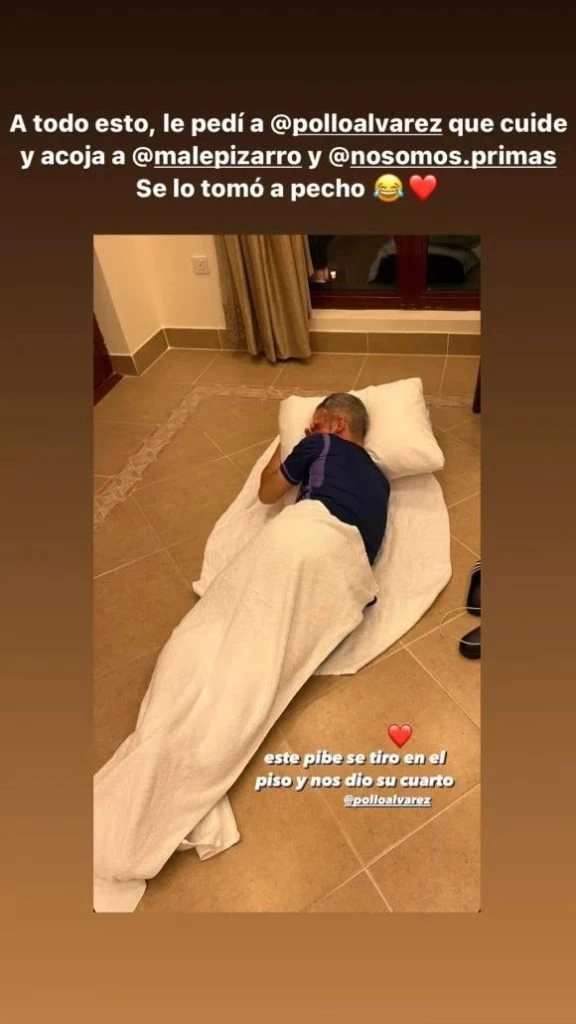 Pero eso no es todo, en las últimas horas el periodista debió ceder su cama y dormir en el piso envuelto por una frazada. Esto sucedió porque dos amigas de su esposa, Tefi Russo, viajaron al país del mundial para presenciar algunos partidos y él se mostró gentil con ellas.