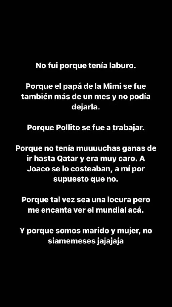 “Porque Pollito se fue a trabajar. Porque no tenía muchas ganas de ir hasta Qatar y era muy caro. A Joaco se lo costeaban, a mí por supuesto no". Porque tal vez sea una locura, pero me encanta ver el mundial acá", siguió.