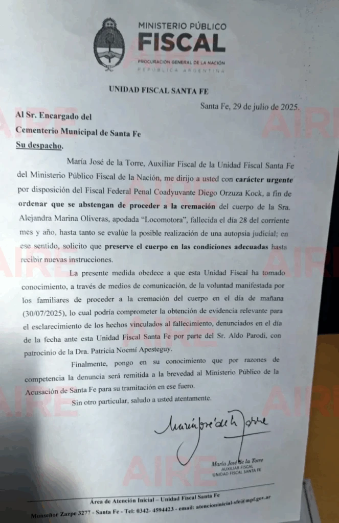 La denuncia ya tuvo impacto en el plano legal. Desde la Unidad Fiscal Santa Fe del Ministerio Público Fiscal de la Nación, se emitió una orden urgente al cementerio donde se iba a realizar la cremación, exigiendo que no se proceda hasta evaluar si corresponde una autopsia judicial.