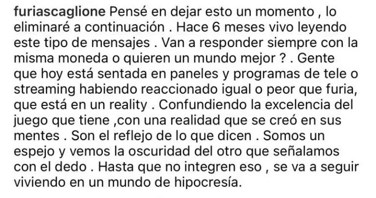 ”Somos un espejo y vemos la oscuridad que tenemos en el otro al que señalamos con el dedo. Hasta que no entiendan eso, vamos a seguir viviendo en un mundo de hipocresía”, finalizó indignada Coy hace unas horas en los posteos que compartió en las redes sociales de Furia.