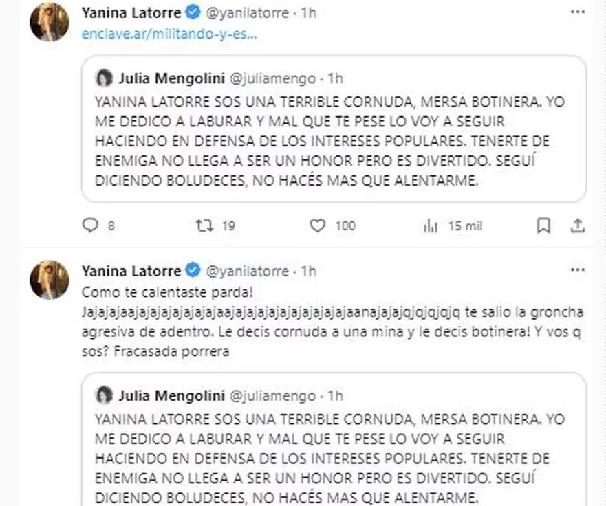 "Yanina Latorre, sos una terrible cornuda, mersa botinera. Yo me dedico a laburar y mal que te pese lo voy a seguir haciendo en defensa de los intereses populares. Tenerte de enemiga no llega a ser un honor, pero es divertido. Seguí diciendo boludeces, no hacés más que alentarme”, publicó Julia en contra de Yanina.