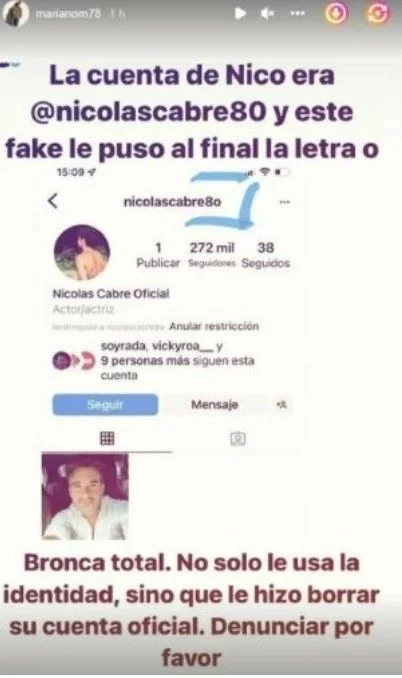 "La cuenta de Nico era 'Nicolascabre80' y este fake le puso al final la letra 'O'…", explicó Mariano a través de una historia. En este sentido, llamó a toda la conunidad a ayudarlos y denunciarla: “Bronca total, no solo le usa la identidad sino que le hizo borrar su cuenta oficial. Denuncien, por favor".