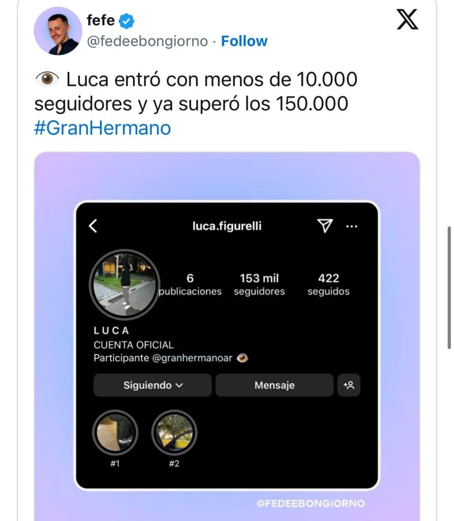 Se trata de Luca Figurelli, uno de los más chicos de la casa quien, tal como arrojan los datos, pasó en un día de tener 9.800 seguidores a 183 mil. Y si bien él no está al tanto de este gran salto en su cuenta fuera mucho se ha hablado y especulado al respecto.