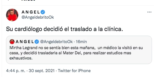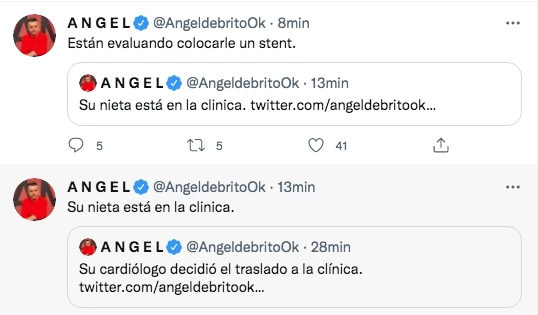 La información brotó sorpresivamente a través de la cuenta de Twitter de Ángel de Brito, quien anunció la decisión del médico de movilizar a la diva a la clínica para la realización de una batería de estudios más específicos en búsqueda de dilucidar el origen de la molestia.