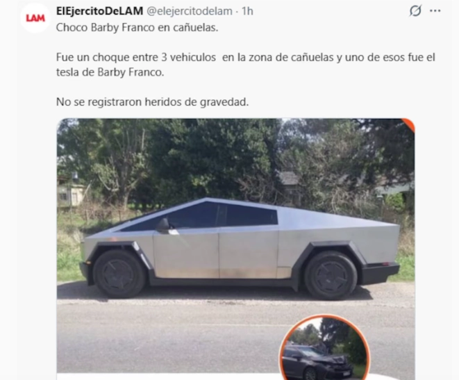 El parte oficial confirmó de la maniobra indebida de un conductor, que luego escapó. Barby detuvo, como pudo, su Tesla eléctrico, que le regaló Fernando Burlando en Navidad, lo que causó que un Ford Maverick y un Toyota Corolla la embistieran de atrás.