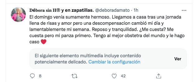 "El domingo venía sumamente hermoso. Llegamos a casa tras una jornada llena de risas y amor pero una descompensación cambió mi día y lamentablemente, mi semana", compartió Débora, desde su red social.