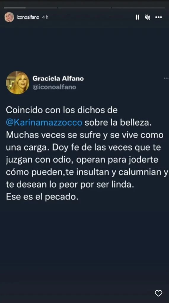 “Coincido con los dichos sobre la belleza. Muchas veces se sufre y se vive como una carga. Doy fe de las veces que te juzgan con odio, operan para joderte cómo pueden, te insultan y calumnian y te desean lo peor por ser linda. Ese es el pecado”, describió a través de sus redes sociales.