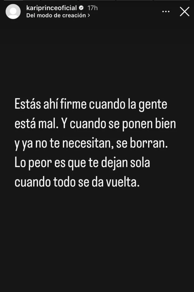 Sin embargo, y cuando todo parecía indicar que la ex del Polaco había utilizado sus cuentas de internet para hacer catarsis y superar problemas íntimos, como la separación de Nicolás Furman, y laborales, Karina volvió a sorprender con un sentido posteo que compartió el domingo 22 por la tarde donde escribió: “Estas ahí, firme, cuando la gente está mal”.