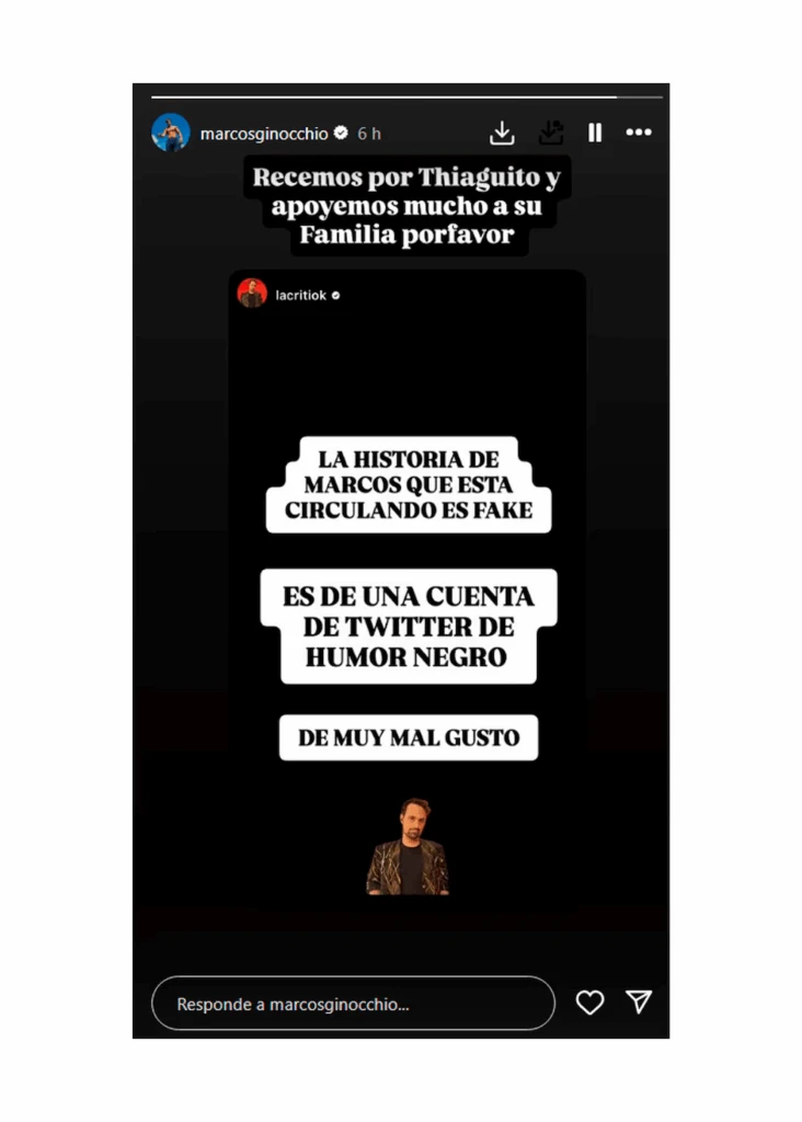 Una supuesta historia atribuida a Marcos Ginocchio hablaba de la muerte de Thiago, lo que generó más preocupación. El ganador de la edición aclaró rápido para llevar tranquilidad: “Recemos por Thiaguito y apoyemos mucho su familia, por favor”.