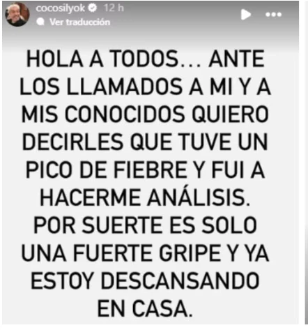 Atento a todo el ruido mediático que se esparció alrededor de su figura, Coco reiteró en su cuenta oficial: “Hola a todos, ante los llamados a mí y a mis conocidos quiero decirles que tuve un pico de fiebre y fui a hacerme un análisis. Por suerte es solo una fuerte gripe y ya estoy descansando en casa”.