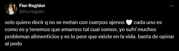 “Solo quiero decir que no se metan con cuerpos ajenos. Cada uno es como es y tenemos que amarnos tal cual somos. Yo sufrí muchos problemas alimenticios y es lo peor que existe en la vida. basta de opinar al pedo”, lanzó Regidor, muy determinante.