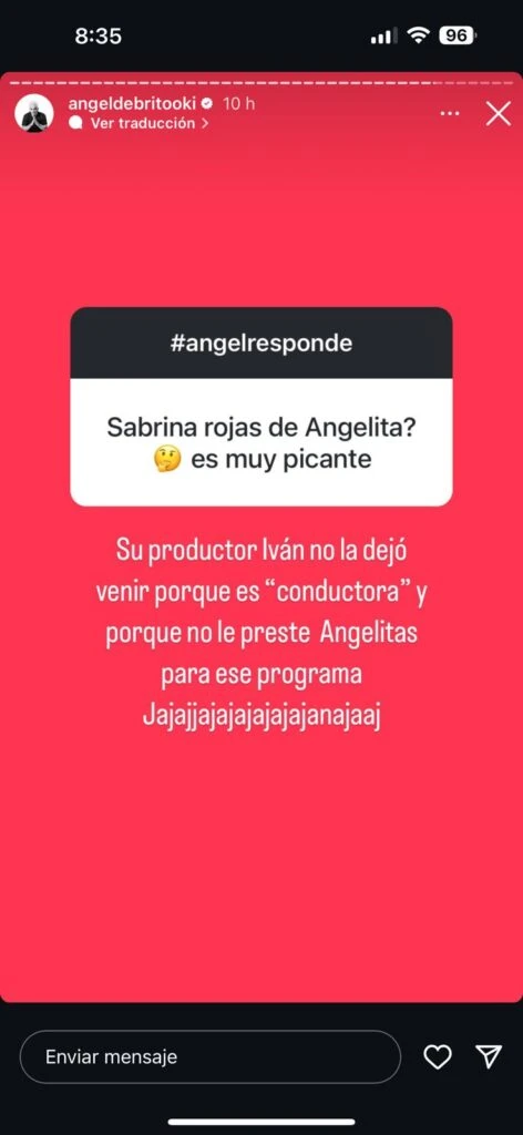 A lo que de Brito, fiel a su estilo frontal y sin pelos en la lengua, disparó: “Su productor Iván no la dejó venir porque es ´conductora´ y porque no le presté Angelitas para ese programa. Jajajaja”. De esa forma, el periodista chicaneó a quienes no la autorizaron y le hizo un pase de factura.