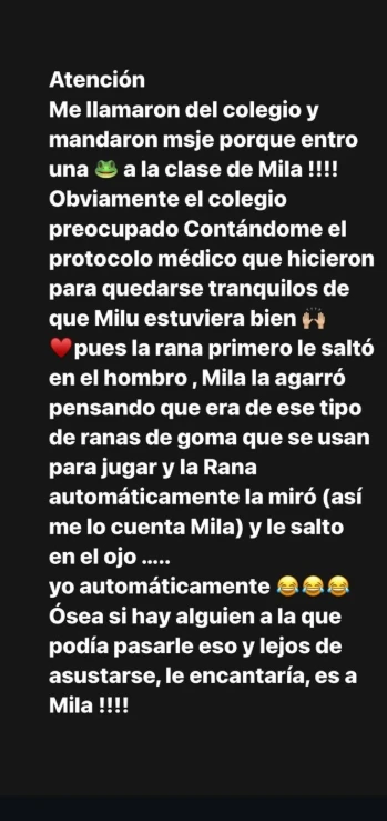 "Obviamente, el colegio preocupado contándome el protocolo médico que hicieron para quedarse tranquilos de que Milu estuviera bien”, avanzó la actriz. ¿Cómo fue la escena? Así lo contó ella: “La rana primero le saltó en el hombro, Mila la agarró pensando que era de ese tipo de ranas de goma que se usan para jugar y la rana automáticamente la miró (así me lo cuenta Mila) y le saltó en el ojo".