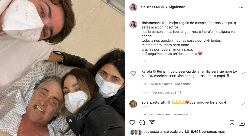Y desde su cuenta de Instagram oficial, Tini publicó una imagen familiar donde se lo ve a su padre en proceso de recuperación. Y a la postal le sumó un tierno escrito dedicado a quien la educó y que, además, es su mano derecha en la carrera artística.