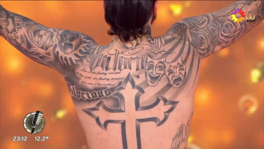 Estrellas, frases, cruces y diversos dibujos mostró el hijo de Mariana Nannis. Laurita Fernández identificó uno de los dibujos de la espalda y quiso saber el por qué: "Tenés las caras del teatro". Tal vez la respuesta no fue la que esperaba la bailarina. "Pintó eso", contestó Alex espontáneo mientras mostraba el dúo de pistolas que lo decoran.