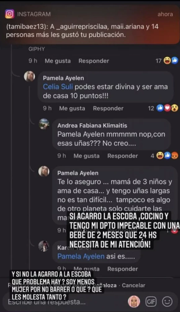 Además, la novia de L-Gante se encargó de responderle a aquellos internautas que cuestionan su estilo de vida y bramó: “Agarro la escoba, cocino y tengo mi departamento impecable con una beba de dos meses que 24 horas necesita de mi atención... ¿Y si no agarro la escoba qué problema hay? ¿Soy menos mujer por no barrer? ¿Qué les molesta tanto?".