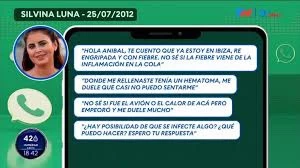 “Hola Aníbal, te cuento que ya estoy en Ibiza, re engripada y con fiebre. No sé si la fiebre viene de la inflamación en la cola”, comenzaba Luna en la conversación del 2012 y luego sumó: “Donde me rellenaste tenía un hematoma, me duele que casi no puedo sentarme”.