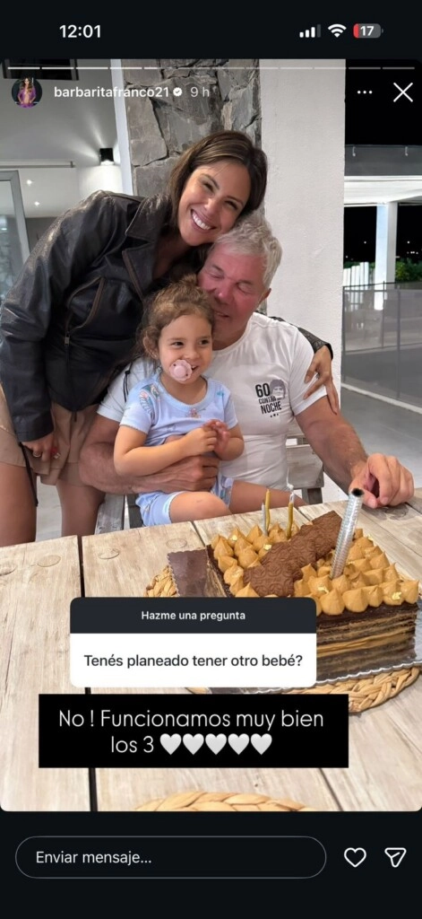 ¿Qué dijo Barby sobre tener más hijos con el prestigioso abogado? “¿Si tengo pensado otro bebé? No, funcionamos muy bien los tres”, tipeó la ex azafata de Guido Kackzca en tanto ilustró la respuesta con una tierna postal junto al letrado y su pequeña Sarah.