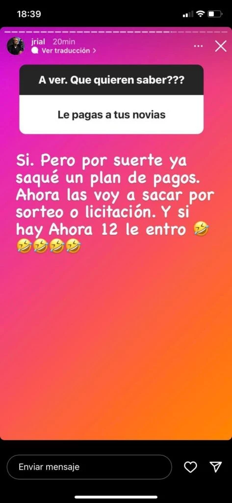 "¿Le pagás a tus novias?", preguntó un usuario. Y Rial contestó: "Sí, pero por suerte ya saqué un plan de pagos. Y si hay Ahora 12... le entro".