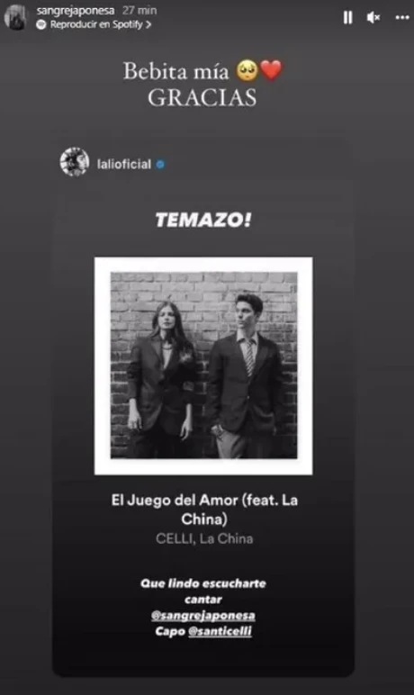 Espósito armó una storie, en la que se ve el reproductor digital con la canción de María Eugenia y le tiró flores y muy lindas palabras: “Temazo, qué lindo escucharte cantar. Capo Santi Celli". La ex de Nicolás Cabré no dejó pasar la oportunidad y se apoyó en el posteo para responderle: "Bebita mía, gracias".