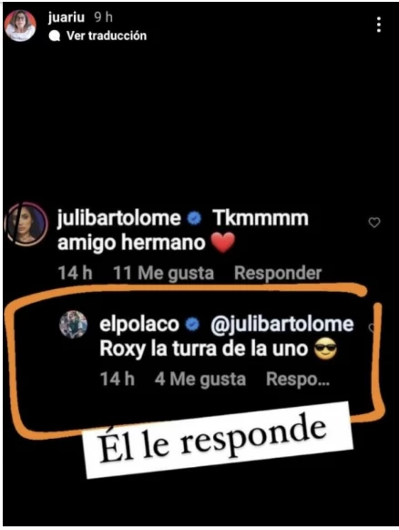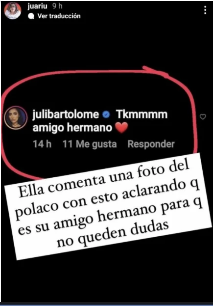 El primer paso fue la storie que posteó Juli de una escena con El Polaco, al que le agregó unos emojis muy amorosos. El siguiente episodio se basó en la decisión de Bartolomé de comentar una publicación del cantante con una frase intimista: “Te quiero mucho, amigo hermano".