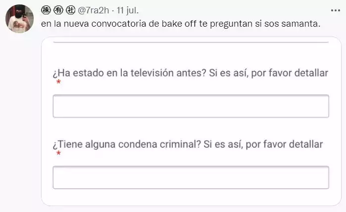 "En la nueva convocatoria de Bake Off te preguntan si sos Samanta"; "Estas preguntas del formulario de inscripción para la nueva temporada de Bake Off, ¡estoy llorando! La producción dijo ´not another Samanta de nuevo´"; “Muy buenas las preguntas para entrar a Bake Off”.