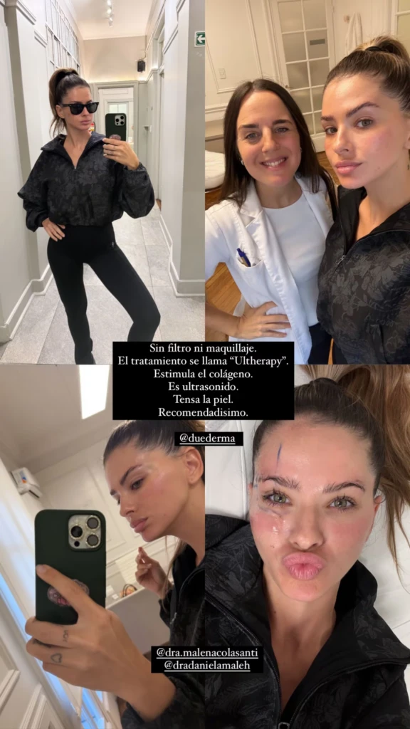 La actriz no lo acompañó al encuentro con las nenas ya que por supuesto no era lo correcto. En cambio, decidió pasar la tarde en una clínica estética para hacerse un retoque en el rostro, horas antes del estreno de su nueva serie. La famosa publicó las fotos de los resultados: “Sin filtro ni maquillaje. El tratamiento se llama Ultherapy”.