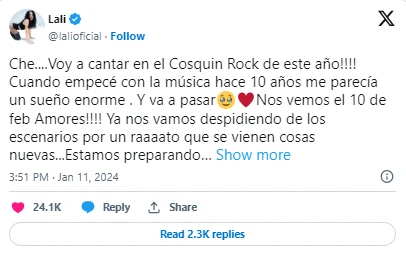Hace poco tiempo Lali Espósito hizo un posteo en la la cuenta de la red social de X que generó polémica. Desde ese día comenzaron las versiones de que se bajaba de los escenarios y generó el alerta en sus seguidores cuando en realidad solo se trataba de un rumor.