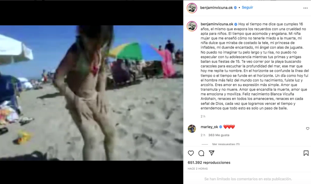 Vicuña suele destinarle mensajes emotivos en sus redes sociales y en esta ocasión acudió a un video de la pequeña, en el que se la percibe sonriente, feliz y jugando en la arena de una playa. Unas imágenes caseras, que forman parte del acervo de Benja y que seguramente se reproducen en su mente cotidianamente.