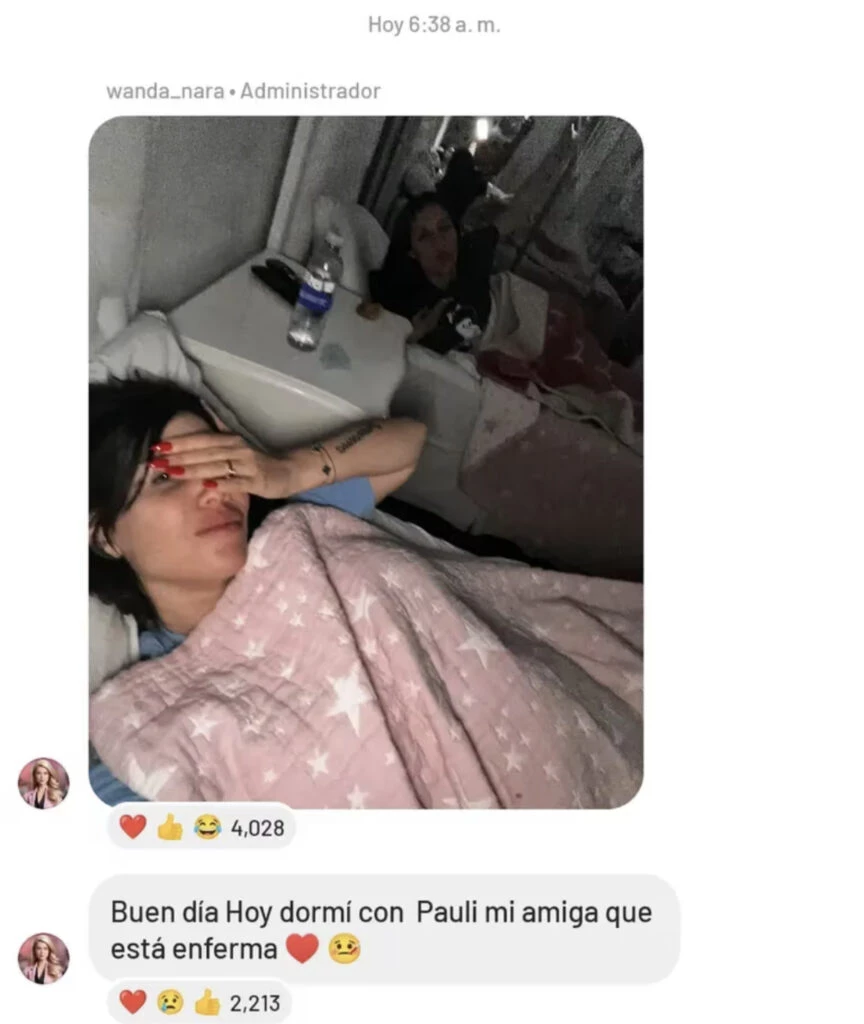Ante lo sucedido, ella decidió responder crudamente a través de sus redes y explicar que eso no era cierto. De esta manera, compartió en su canal de difusión de Instagram una foto durmiendo en lo de una amiga. “Buen día. Hoy dormí en lo de Pauli, mi amiga que está enferma”.