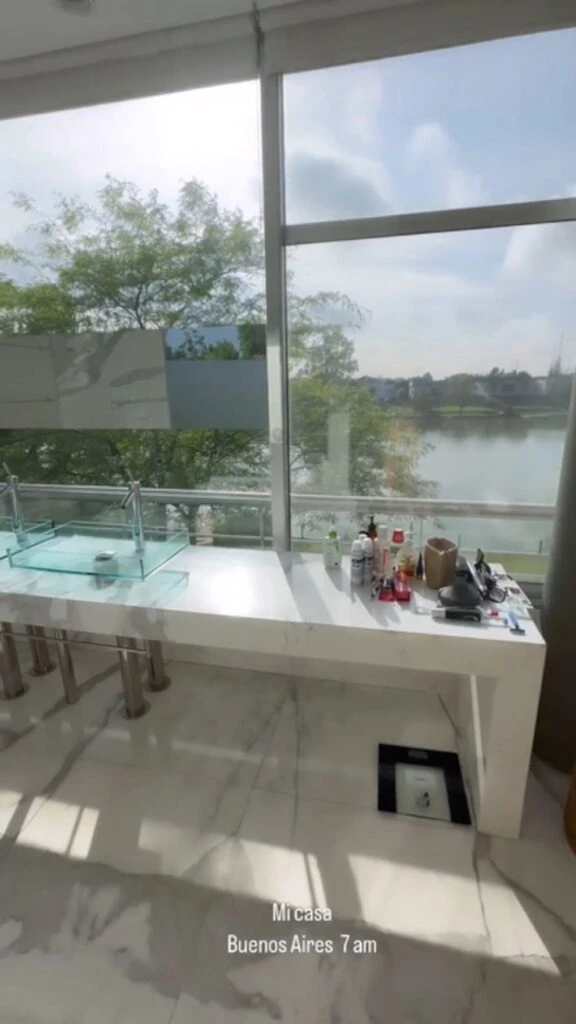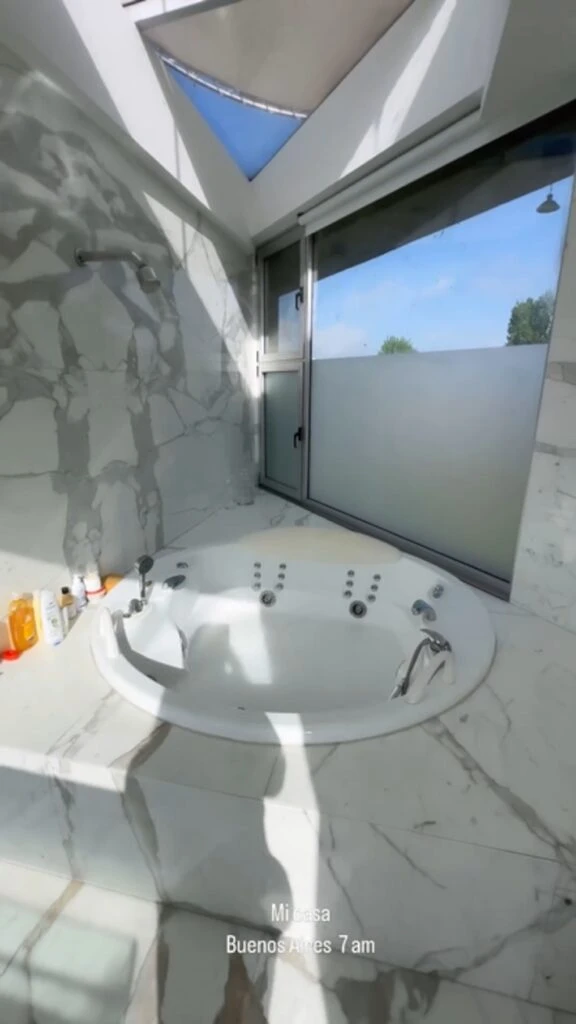 La modelo mostró cómo comenzó su mañana desde su hogar. “Mi casa. Buenos Aires. 7 am”, escribió Wanda junto a un video que grabó desde el baño. En el clip, se vio su impresionante habitación, con un gran hidromasaje y dos lavamanos de cristal. También mostró el exterior, donde se veían las piscinas gigantes y los lagos que rodean su casa.