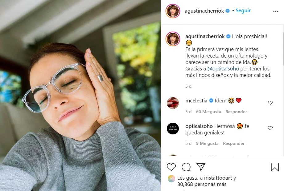 "¡Hola, presbicia! Es la primera vez que mis lentes llevan la receta de un oftalmólogo y parece ser un camino de ida”, escribió Cherri, a quien los anteojos le quedan divinos.