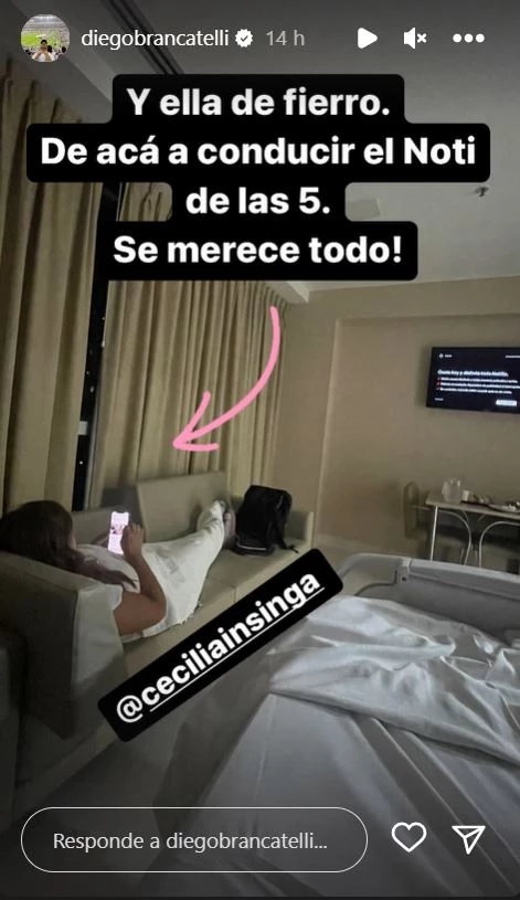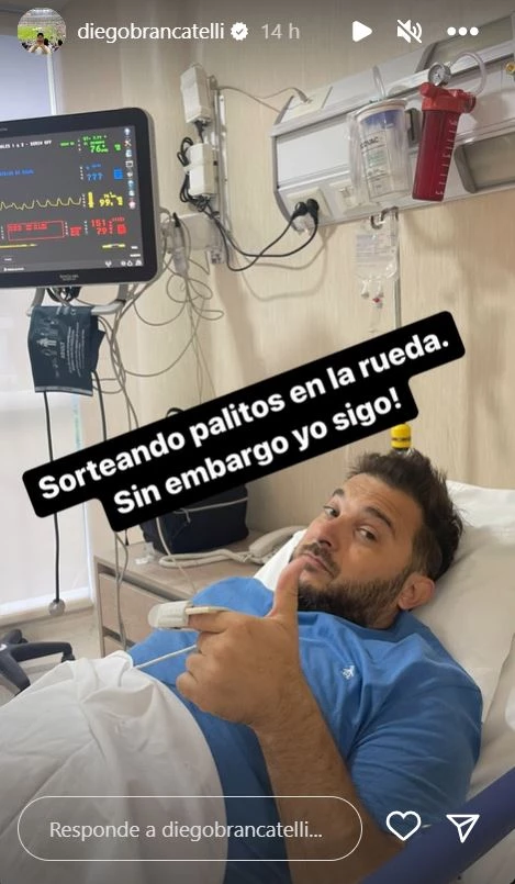 Feliz con el apoyo recibido en las últimas horas de parte de sus amigos y seguidores, Brancatelli agradeció los mensajitos y mostró el aguante que le hace su pareja, Cecilia Insinga, quien no lo dejó solo ni un momento desde que ingresó al centro de salud porteño.
