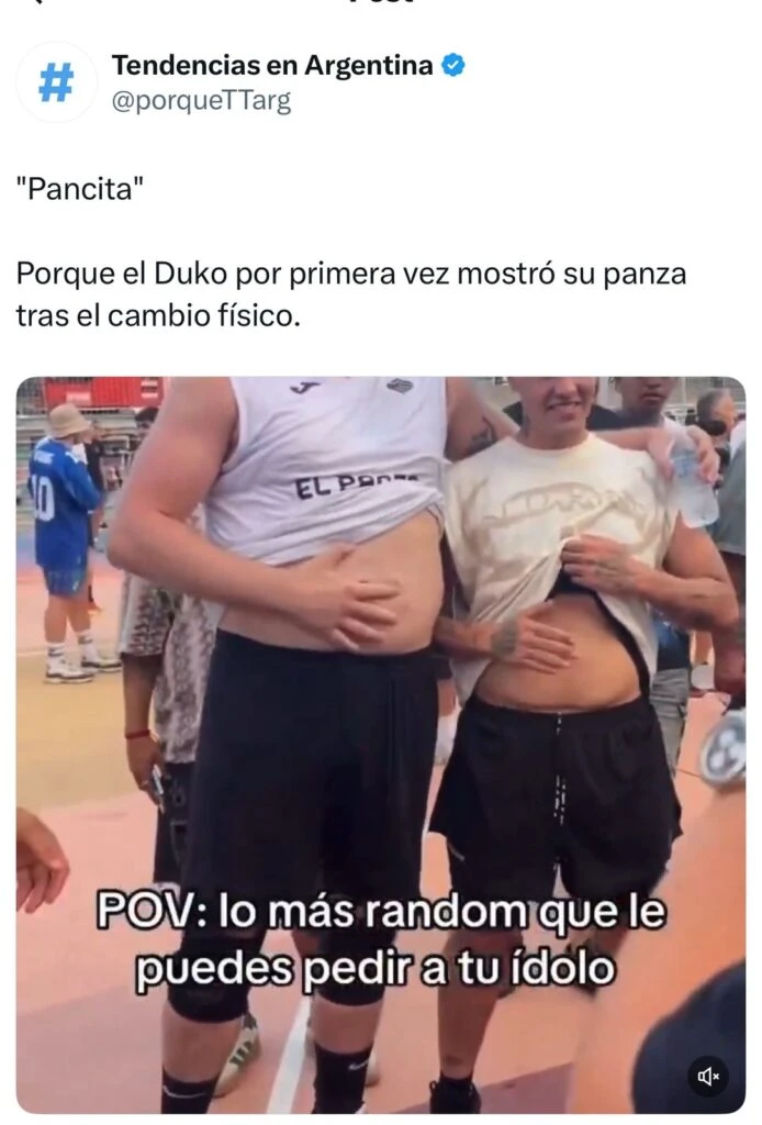El muchacho que cumplía el sueño de saludar saludar y grabarse con su ídolo le pidió al rapero argentino que se levante la camiseta y muestra la panza. Acto que tomó con buena onda el novio de Mernes y accedió dando golpecitos en el vientre. De esa forma, Duko mostró cómo quedó su cuerpo al perder tanto peso. Pero así como muchos salieron a bancar la complicidad del músico no faltaron los haters.