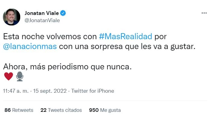 Sin embargo, hacia el mediodía del jueves 15, Viale anunció en Twitter que su descanso terminó. “Esta noche volvemos con #MasRealidad por @lanacionmas con una sorpresa que les va a gustar. Ahora, más periodismo que nunca”, escribió en la red del pajarito, y sumó un corazón y un micrófono. ¡Vuelve al ruedo!