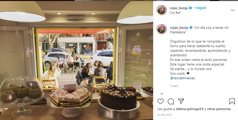 Y en el caso de Martina, la cocinera ama la pastelería y siempre quiso tener su propio lugar. Esto se hizo posible hace poco y fue Benjamín quien lo registró en las redes con una foto del lugar: "Orgulloso de lo que te rompiste el lomo para llevar adelante tu sueño, cayendo, levantándote, aprendiendo y acertando!", posteó.
