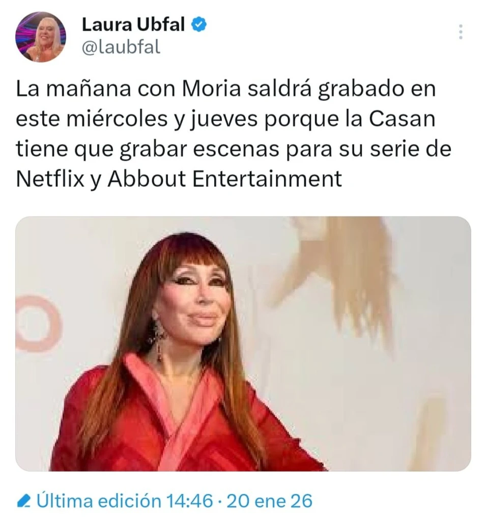 “La mañana con Moria saldrá grabado en este miércoles y jueves porque la Casán tiene que grabar escenas para su serie de Netflix y Abbot Entertainment”, informó la Ubfal en la ex red social del pajarito, llevando tranquilidad a los televidentes que se quedarán, durante 48 horas, sin el vibrante vivo de la capocómica más querida del país.