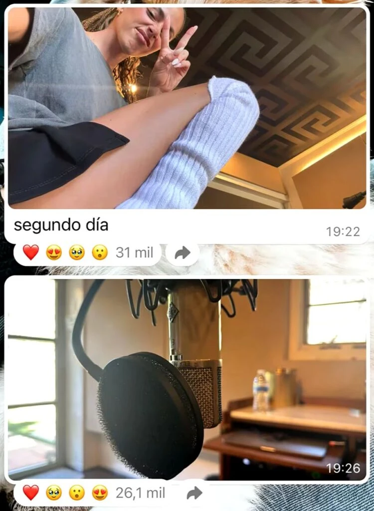 Esta vez, Martina pretendió contarle a su público qué tal había sido el día laboral y se tomó una foto dentro del estudio de grabación, agregando en emoji que representaba su emoción, el mismo que aparece en el videoclip de su canción La original junto a Emilia Mernes. Horas más tarde hizo algo similar exponiendo parte de lo que fue su segunda jornada.