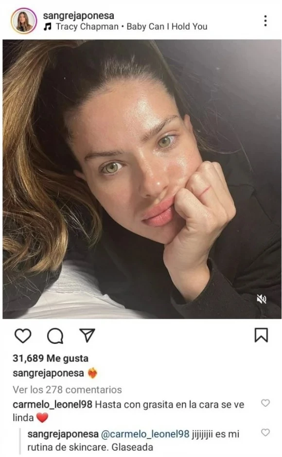 Ahora bien, resulta que la China Suárez vuelve a ser noticia, pero esta vez por una foto que compartió en su cuenta de Instagram donde se la ve a cara lavada. Fue entonces que una seguidora escribió: "Hasta con grasita en la cara se ve linda". A lo que ella respondió: "Ji, ji ji… Es mi rutina de skincare (cuidado de la piel), glaseada".
