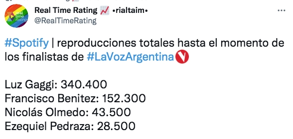 Es por eso que, desde Spotify, siendo una de las aplicaciones más utilizadas para reproducir música, hicieron la lista de los participantes más escuchados y fue el usuario de Twitter Real Time Rating quien mostró la cantidad de reproducciones que tienen cada uno de los finalistas.