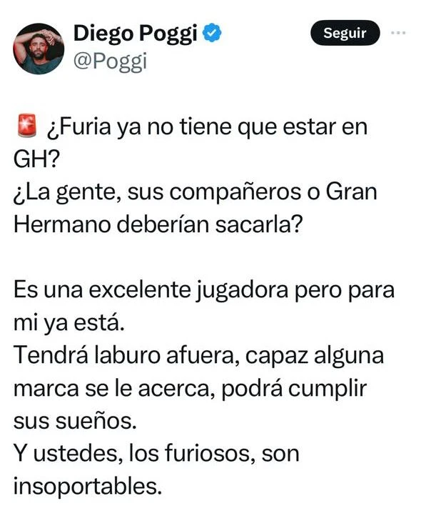 “¿Furia ya no tiene que estar en GH? ¿La gente, sus compañeros o Gran Hermano deberían sacarla? Es una excelente jugadora pero para mí ya está”, escribió Diego Poggi en su cuenta personal de Twitter donde luego agregó: “Tendrá laburo afuera, capaz alguna marca se le acerca, podrá cumplir sus sueños”.