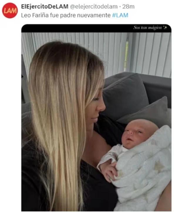 La novedad por estas horas es que Fariña se convirtió en papá junto a su esposa Camila y en las redes sociales se dieron a conocer las imágenes. Si bien la viralización no se dio a través de los felices papis, desde la cuenta de X de El Ejército de LAM compartieron una dulce postal de la pareja con la pequeña recién nacida.