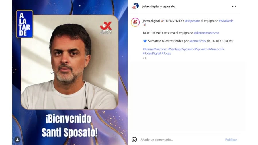 La confirmación llegó de la mano de la propia productora del ciclo vespertino. Desde las cuentas oficiales de Jotax lanzaron un mensaje que despejó cualquier rumor: “Bienvenido @ssposato al equipo de A la tarde. Muy pronto se suma al equipo de Karina Mazzocco”. Así, el periodista desembarca con nuevo aire, en un panel que suele ser picante y que promete darle aún más condimento a las tardes de América.